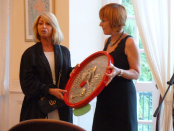 The exhibition was opened by Ms Sara Nemes, Chairman of the Board of Directors of the Hungarian Post. Many of my friends visited the ceremony which was also attended by the world-famous magician Aniko Ungar so I had at last the opportunity to meet her. It was she whose tools inspired my picture titled Waiting for Eve, Magician in the Eden. Although it had not been planned but we presented the picture to the audience together. There was another un-planned part of the ceremony, I presented my husband who plays an important part in my art as well. We unfolded together the story of our visit made to Vatican to visit the pope.